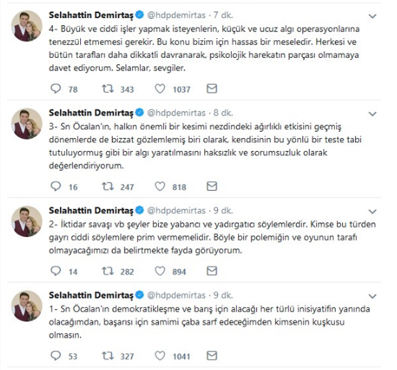 Selahattin Demirtaş, Öcalan’ın AKP’ye destek olan ve “HDP’de krize neden oldu” şeklinde yorumlar yapılan mektubu ile ilgili, “Böyle bir polemiğin ve oyunun tarafı olmayacağımızı da belirtmekte fayda görüyorum” ifadelerini kullanıldı. Demirtaş açıklamalarının devamında, “Herkesi ve bütün tarafları daha dikkatli davranarak, psikolojik harekatın parçası olmamaya davet ediyorum” dedi.