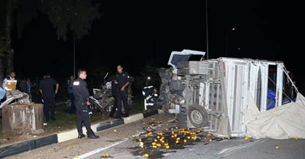 Kaza Muğla-Fethiye Karayolu Osman Kaya Bulvarı Karagedik kavşağında meydana geldi. Ümit E. (33) yönetimindeki 32 AD 291 plakalı limon yüklü kamyon, Mustafa Kılıçarslan (54) idaresindeki 48 GZ 191 plakalı otomobille çarpıştı. Çarpışmanın etkisiyle refüjde bulunan aydınlatma direğini yerinden söken araçlar yaklaşık 25 metre sonra durabildi.
