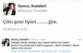Gonca Vuslateri, iddiaya göre Başbakan Recep Tayyip Erdoğan’ın televizyondaki konuşması sırasında Twitter’ına “Çıktı gene tipini ...ğim” yazdı.