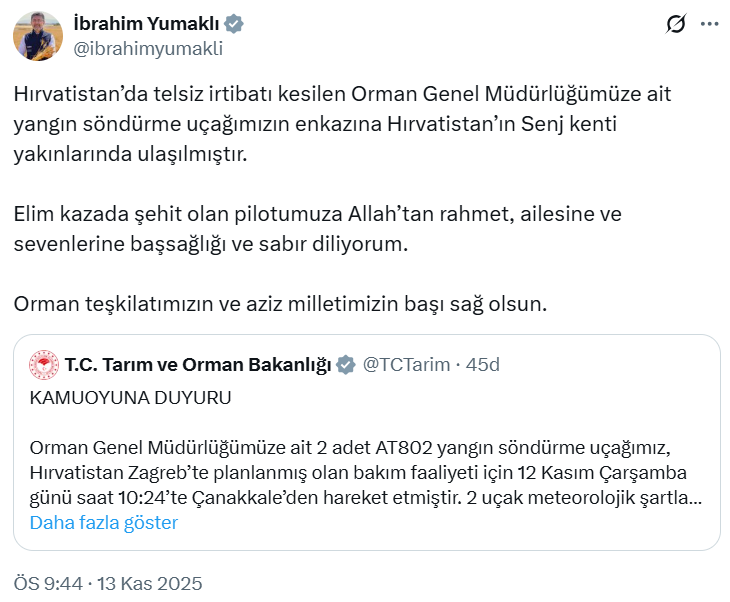 Kazanın ardından açıklama yapan Tarım ve Orman Bakanı İbrahim Yumaklı, uçağın enkazına ulaşıldığını ve pilotun şehit olduğunu duyurdu.