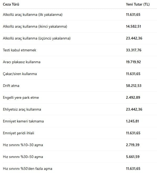 1 Ocak 2026 tarihi itibarıyla güncel trafik cezaları şu şekilde: